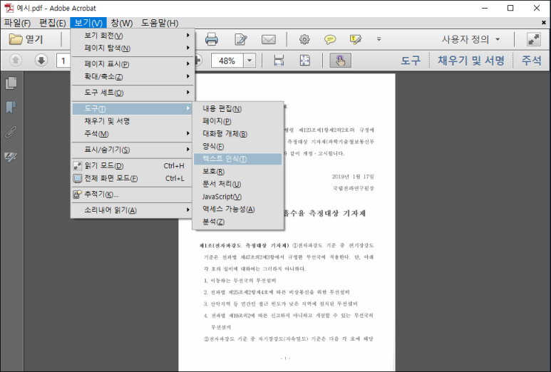 3. 보기-도구 순으로 선택하여 하기의 스크린샷 처럼 텍스트 인식을 눌러준다.