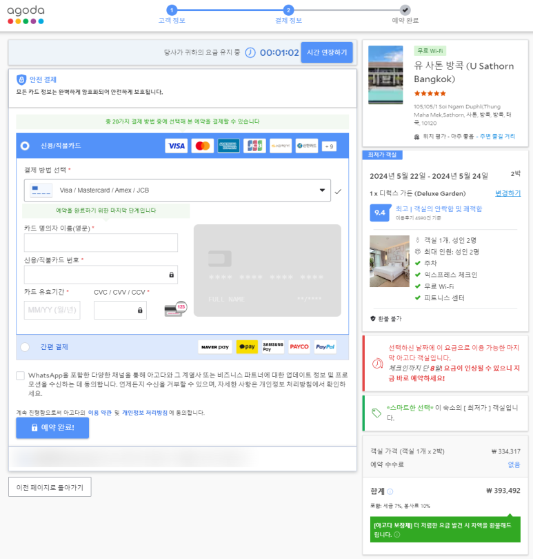 오른쪽: PC로 아고다 비회원으로 같은 숙소와 날짜로 설정한 뒤 나온 최종 가격 = 393,492원