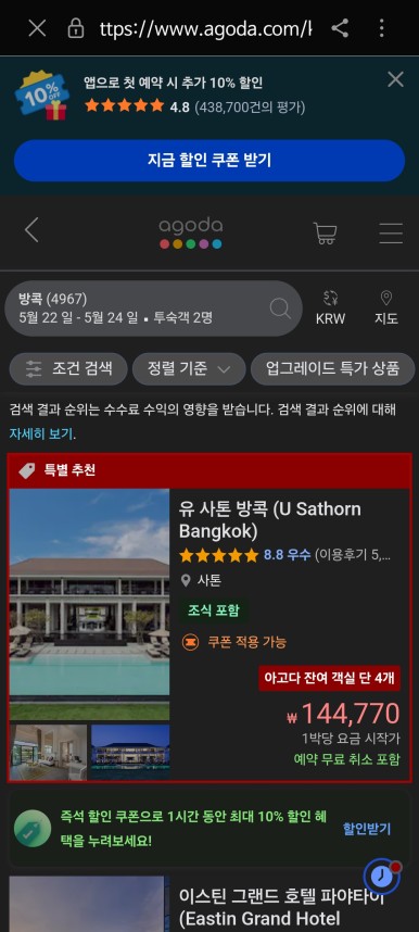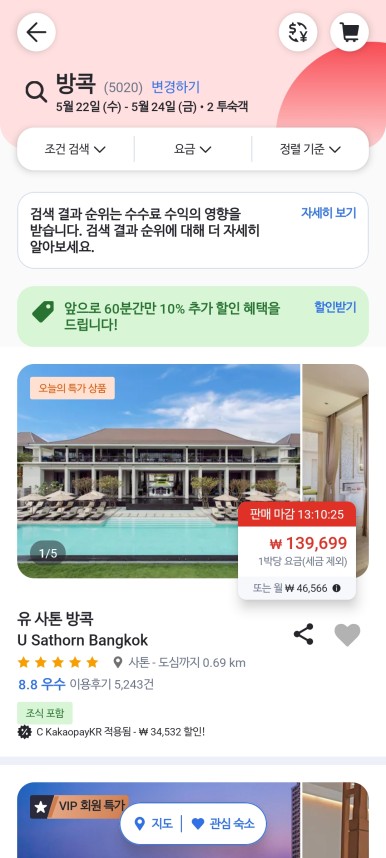 캡쳐화면에는 푸꾸옥 섬을 검색했는데, 실제로 비교해보기 위해서 2024년 5월 22일 ~ 5월 24일 1객실 2인 기준으로 방콕의 숙소를 검색했습니다.