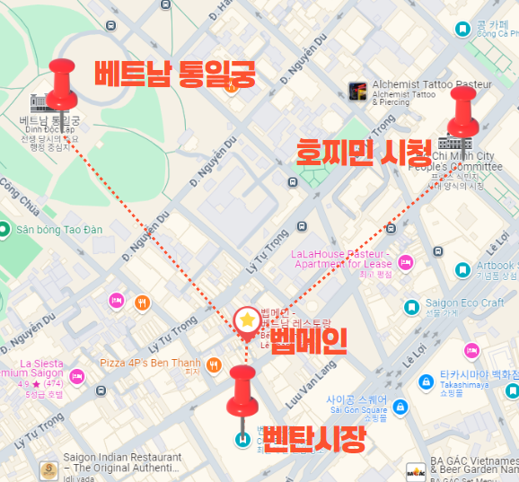 벱메인은 벤탄시장에서 약 100m 정도 떨어진 거리에 위치해있습니다.