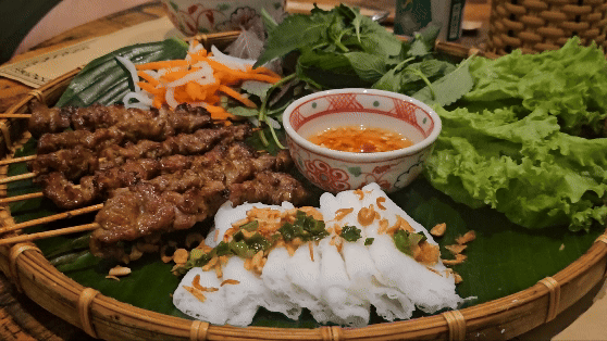 울금을 넣어 노란 쌀가루 반죽물에 채소와 해산물 등을 넣어 크레프처럼 얇게 부친 베트남 전통 음식